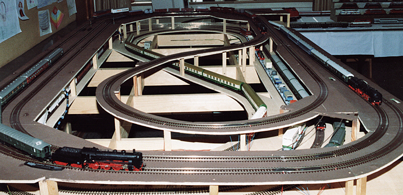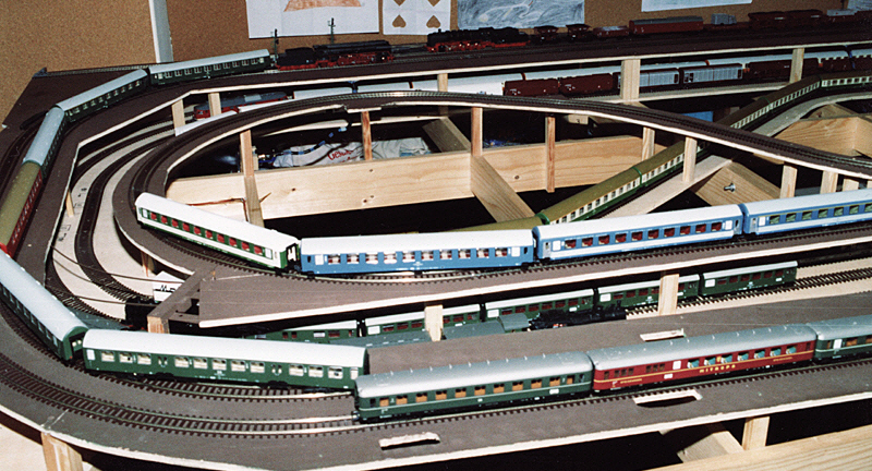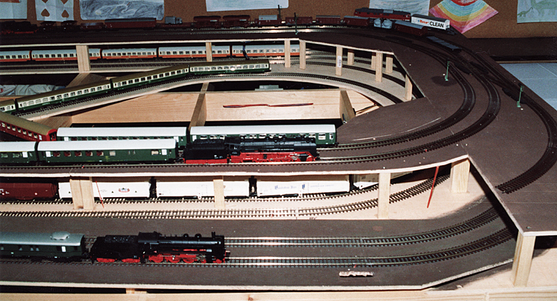 Das Besondere an der Anlage war ein Schattenbahnhof für 10 Züge ohne den Einbau einer einzigen Weiche, wodurch ich eine sehr hohe Betriebssicherheit im verdeckten Bereich erreichte. Nachteilig wirkte sich aus, dass keine Zugwechsel im Schattenbahnhof stattfinden konnten. Insgesamt war auf der zweigleisigen Hauptstrecke ein Betrieb von 12 Zügen im automatischen Blockbetrieb möglich. Im sichtbaren Bereich konnten im Durchgangsbahnhof die notwendigen Zugüberholungen stattfinden, dort zweigte auch eine eingleisige Nebenbahn zu einem kleinen Kopfbahnhof ab. Um ausreichend Abwechslung in das Betriebsgeschehen zu bringen, wurde die Nebenbahn ausschließlich im manuellen Fahrbetrieb bedient.